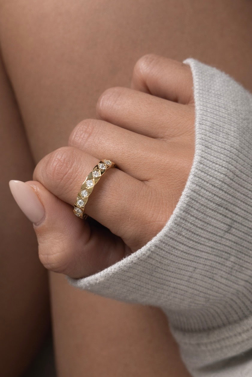To preserve the sculptural finish of your jewelry, we recommend storing pieces in their pouch when not in use and avoiding exposure to harsh chemicals, perfumes, or water. Gently clean with a soft cloth or mild soap as needed to maintain their natural luster.